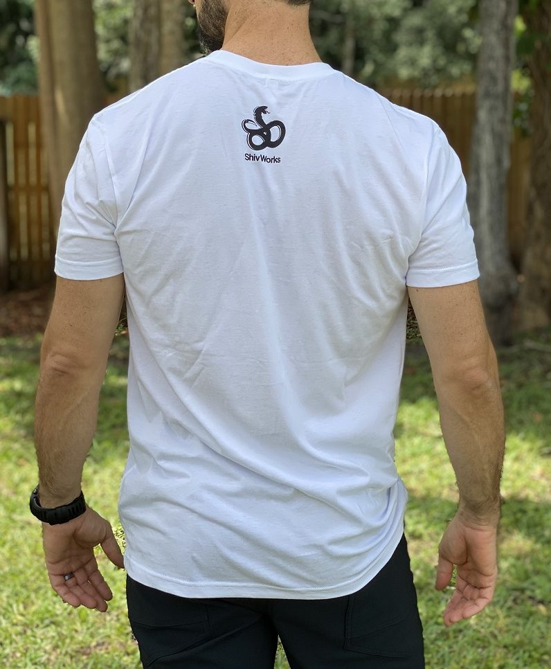 Shivworks Next Level 100% cotton soft t-shirt. White shirt with black Shivworks logo on the front and small logo under the collar line on a white shirt. Perfect for warm summer days. We received a special price from our supplier so we passed the saving on to the our custormers.
